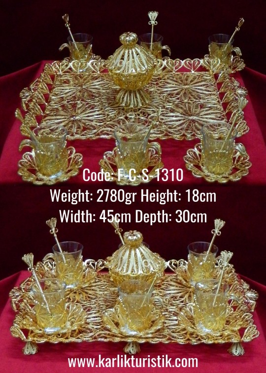 6 lı Bakır Osmanlı Elişi Telkari Has Altın Kaplama Çay Seti - F-C-S-1310